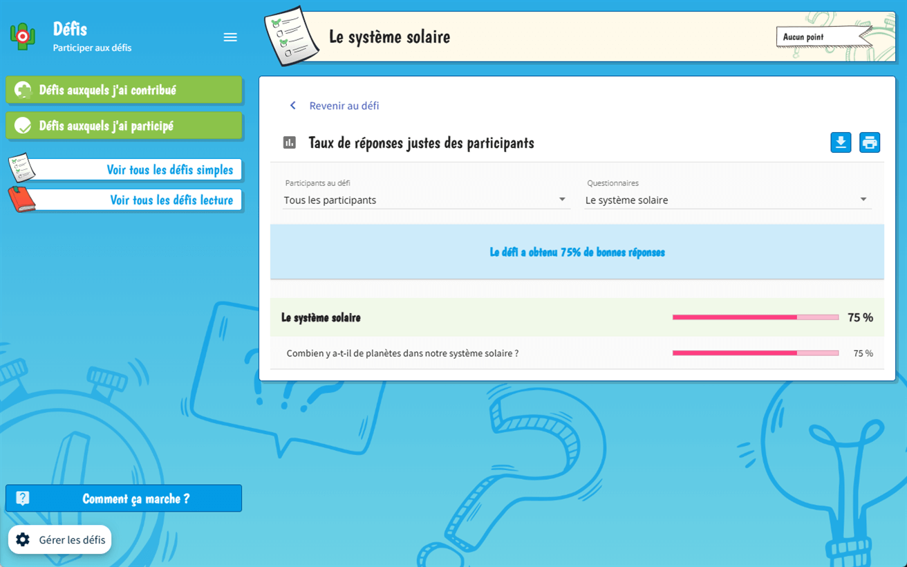 Les réponses sont sauvegardées, l'élève peut mettre « pause » et reprendre plus tard. Les défis se font dans des conditions idéales.