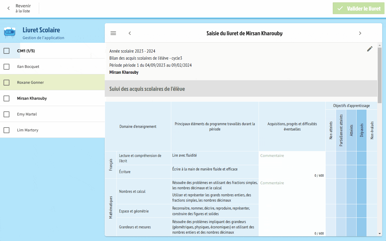 Le livret scolaire vous permet de saisir les bilans des élèves directement sur Beneylu School, puis de les importer sur la base nationale.