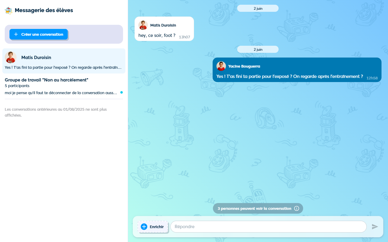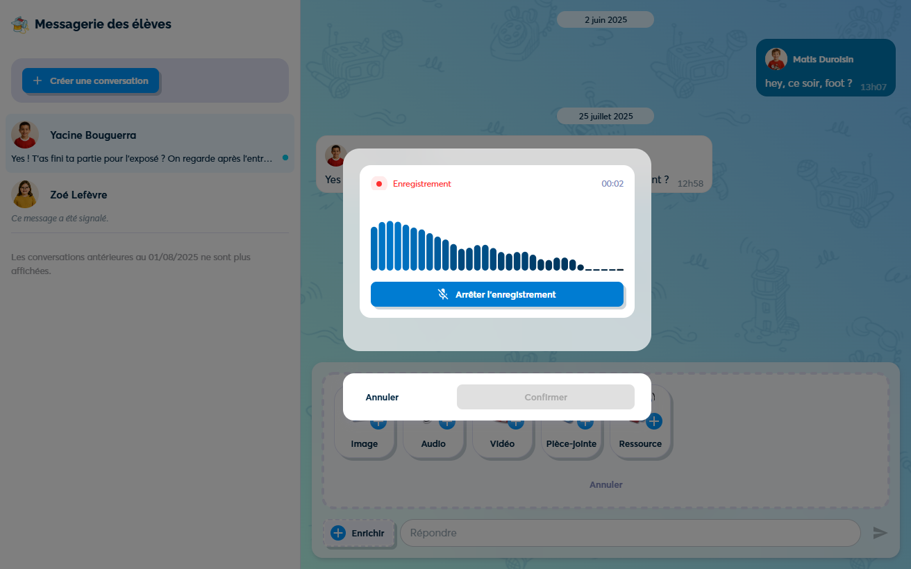Parce qu’il faut convaincre les élèves que c’est bien le meilleur endroit pour accueillir leur correspondance en ligne, la messagerie des élèves permet de s’envoyer des messages instantanés et des audios.