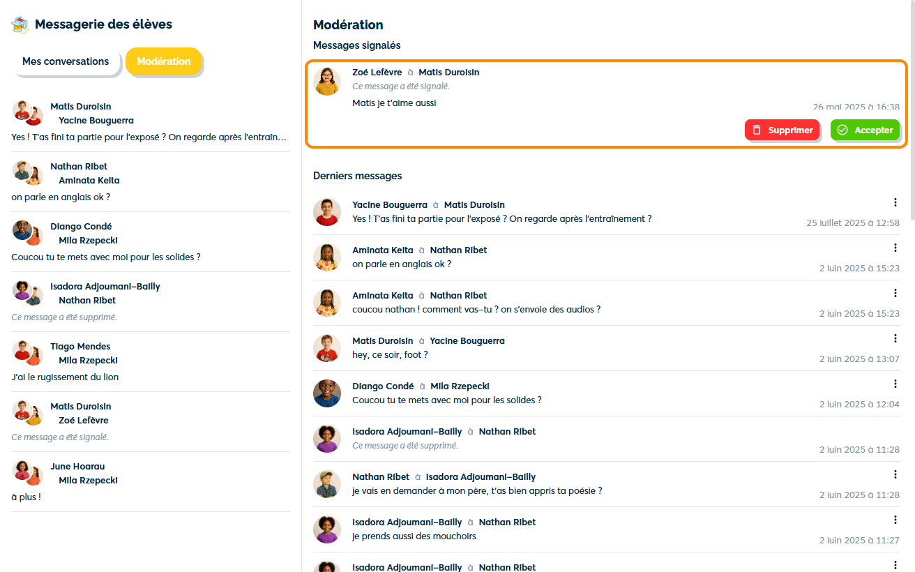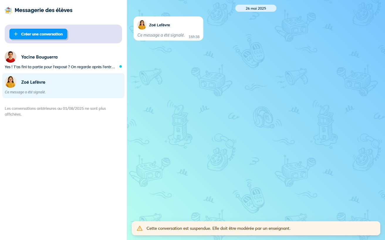 Les élèves peuvent signaler des messages à leur enseignant et bloquer ainsi préventivement la conversation. L’enseignant peut alors prendre les mesures qui lui semblent utiles pour protéger et éduquer.
