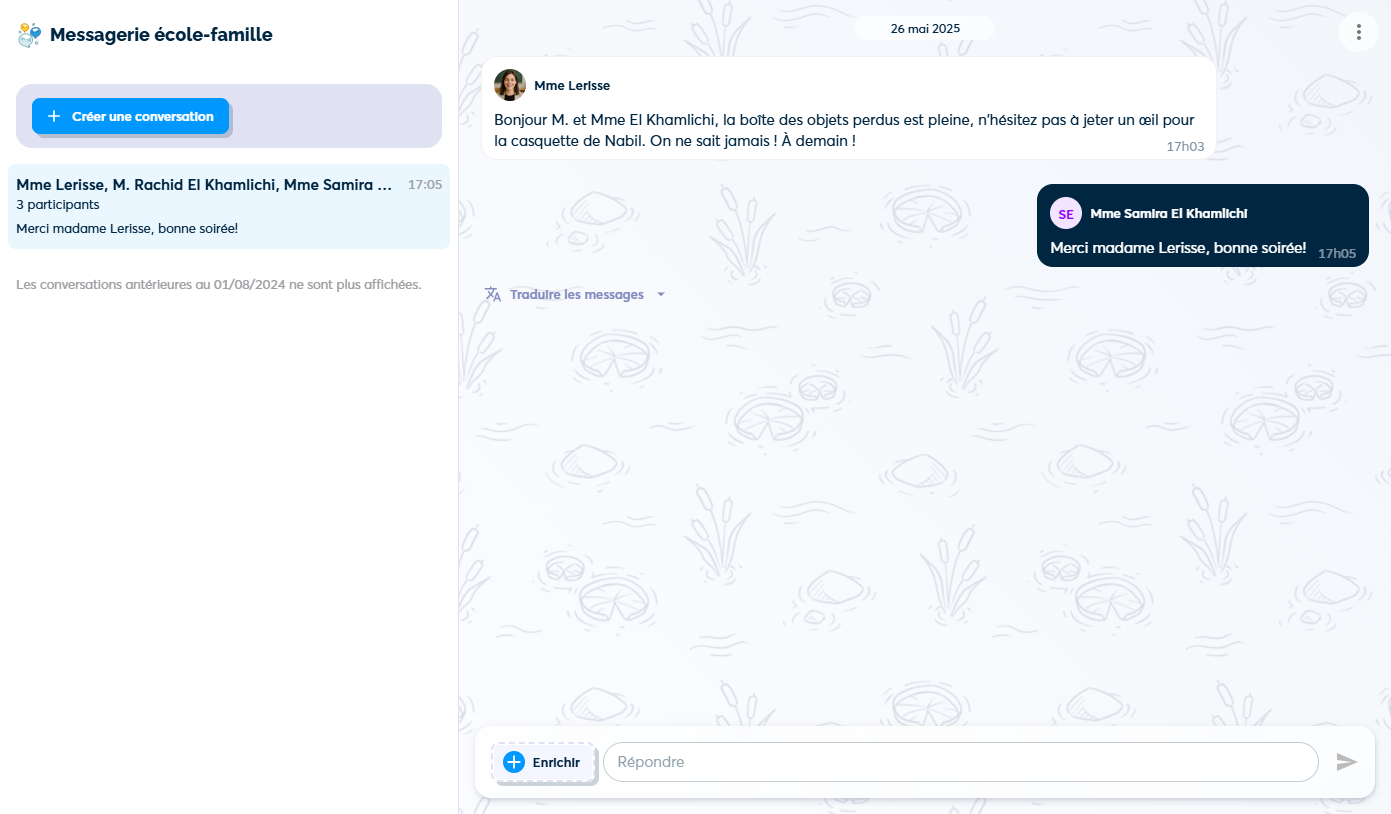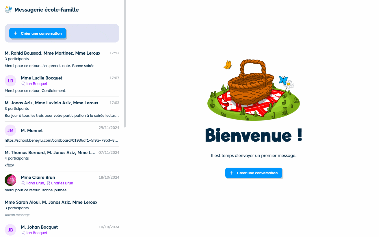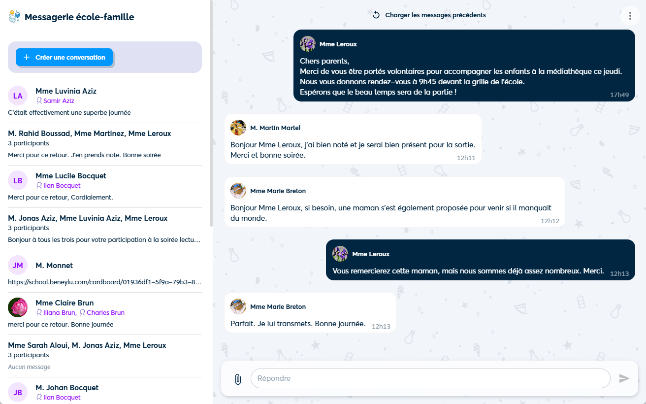 La messagerie école-famille permet d'organiser des échanges privés avec chaque famille, pour faciliter le lien entre l'école et la maison.