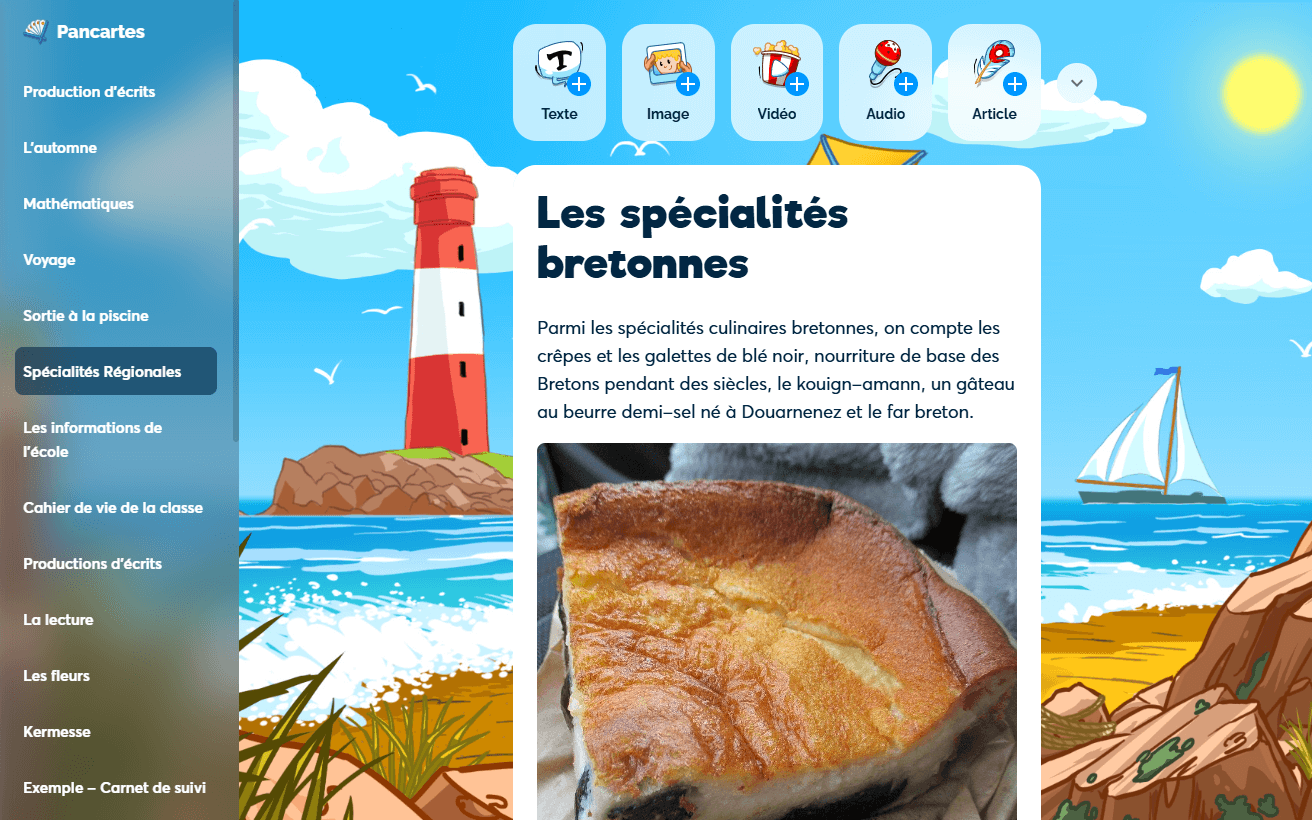 Les élèves collent une carte image, vidéo, texte, son, article, pièce jointe. La carte se construit à l’endroit où elle sera publiée.